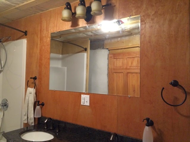 Mirror, lights and towel holders. We are going to add two small mirrors on either side of the light switch. Turns out none of the kids can see into the mirror!